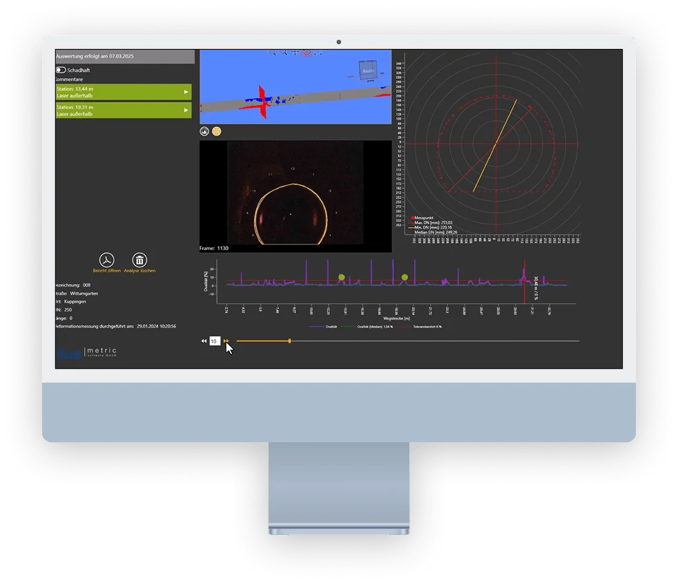 Laserbasierte Messwerte liefern belastbare Zahlen für Ovalität, Durchmesser und Profil, die direkt in Analyse und Sanierungsplanung einfließen.